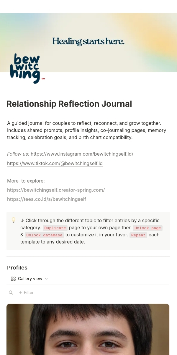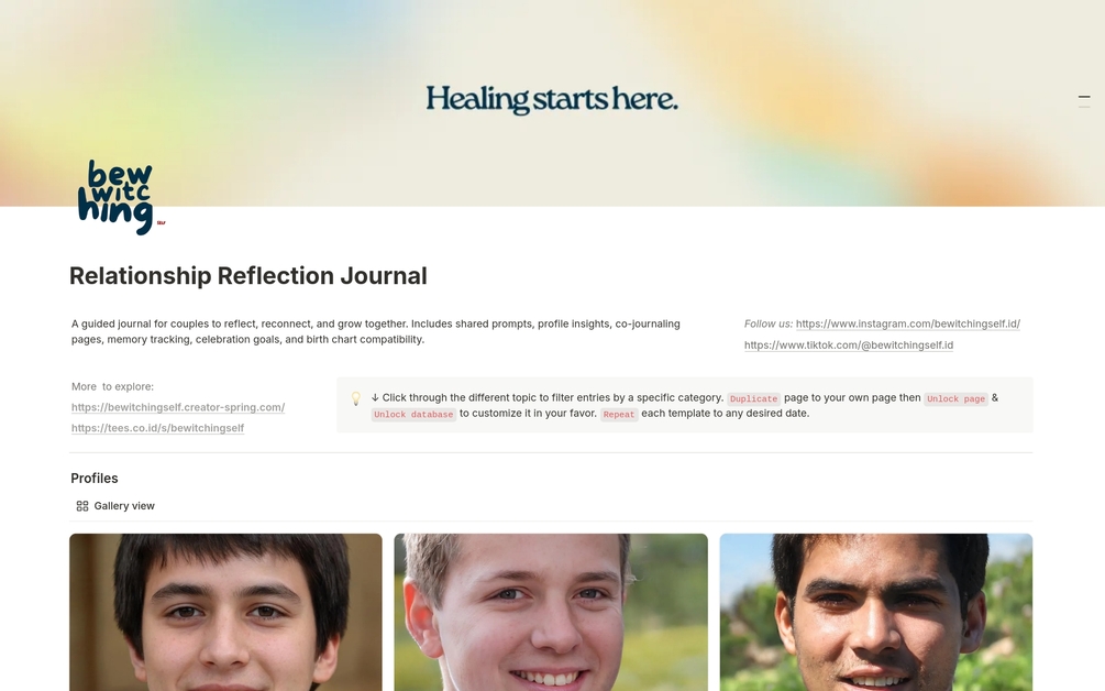 [Notion Template ] Relationship Reflection & Compatibility Journal – Guided Prompts, Birth Chart Sync & Co-Journaling for Healing & Growth